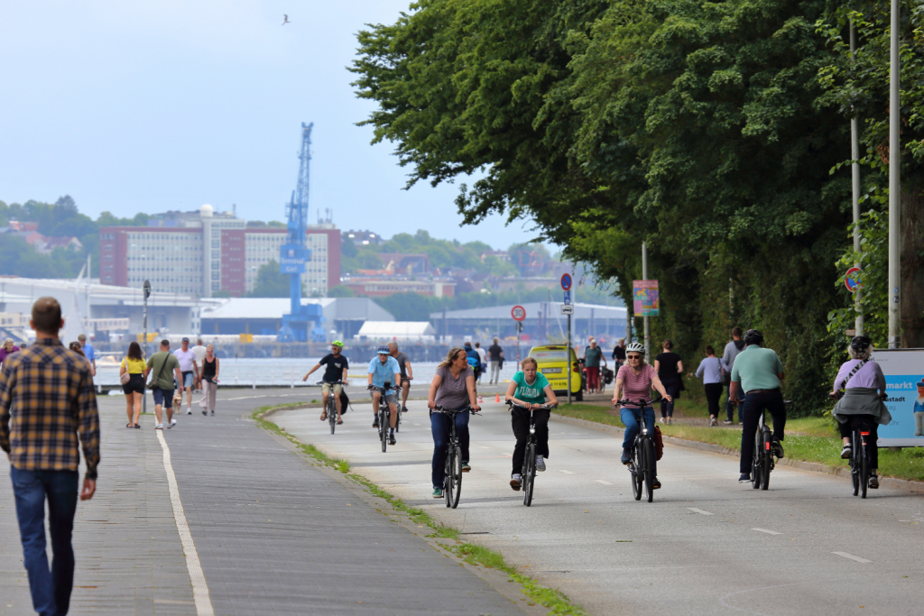 It is often claimed that the northern Kiellinie has no significance for bicycle traffic—or only for recreational use. Critics of the car-free Kiellinie often ignore the fact that this area is part of Veloroute 1, part of the Baltic Sea Cycle Route, and one of the most frequently used connections for bicycle traffic. The Kiellinie Nord is the only connection between Wik and the northern districts of Kiel and the city center that does not have any significant inclines. It is therefore particularly important for the mobility of less experienced, disabled, younger, and older people who use bicycles.