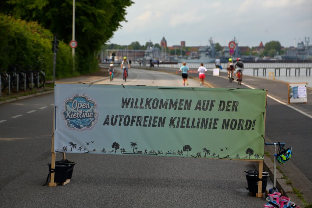 During OpenKiellinie, it is finally possible to take a relaxed stroll without noise, children learn to ride bicycles, play badminton on the road and draw with chalk. During OpenKiellinie, people on bicycles – especially those coming from the north – can safely and comfortably ride through this section of road without being harassed or endangered by motorists.